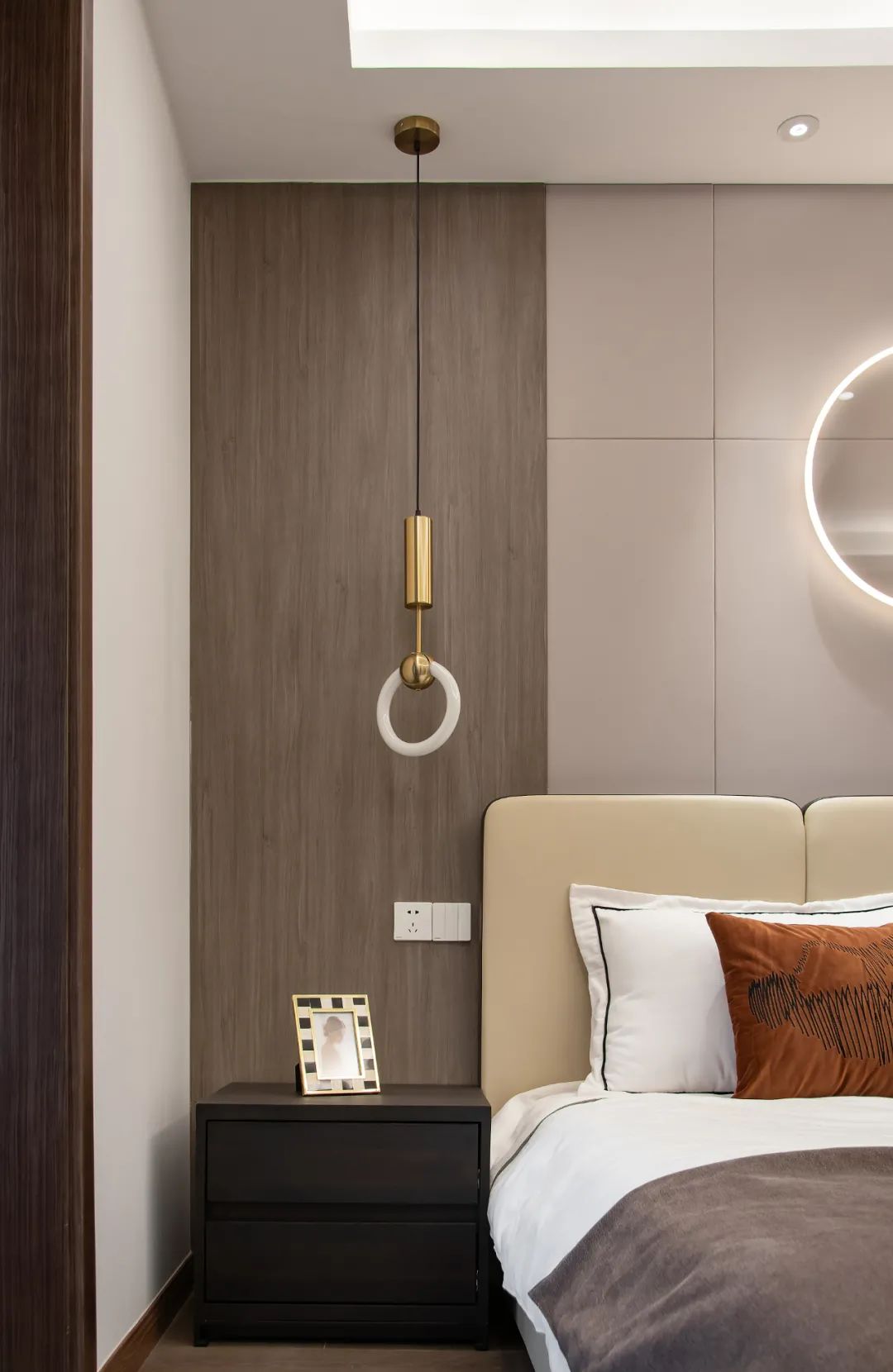 主臥用木紋、白、灰三色將整體空間串聯起來,保持全屋的統一基調;分色墻組合燈線,增添空間層次感的同時,又給了臥室獨有的小心機。